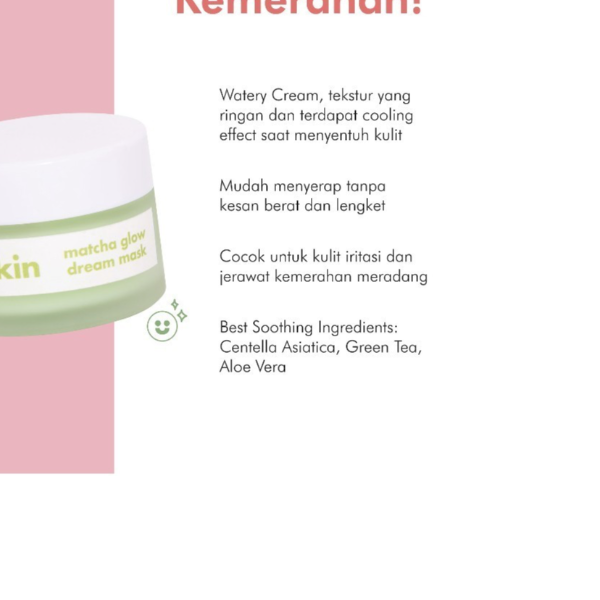 Matcha Glow Dream Mask,2 in 1 Moisturizer dan sleeping mask yang ringan membuat kulit terasa lebih sehat dari hari sebelumnya dengan tiga kandungan antioxidant untuk meredakan dan megurangi bekas jerawat kemerahan. Bekerja saat kamu tidur untuk menghidrasi, menenangkan dan mencerahkan dipagi hari
